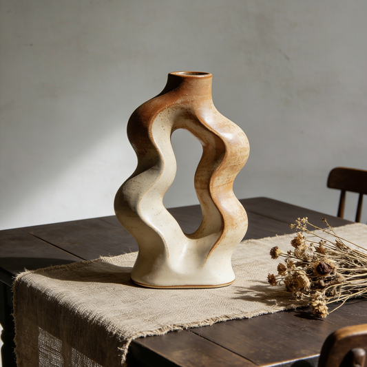 Wavy Hollow Ceramic Vase - Organic Sculptural Terracotta & White Flower Vase