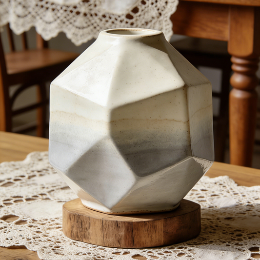 Faceted Gradient Ceramic Vase - Modern Geometric Grey & White Flower Vase with Wooden Base
